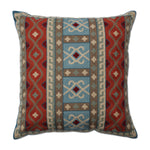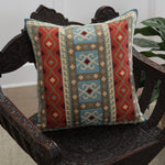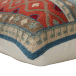 Give a lavish touch of flair to any decor with this one-of-a-kind decorative pillow. In ravishing kilim fashion, framed vertical stripes full of unique geometric motifs, hourglass curves and ornamental detail are woven in intricate crewel embroidery from edge to edge on its front. Coordinating colors in light shades of blue and green along with burnt orange, deep red and natural catch your eye. Stripes and elements in the design as well as the pillow's outer edge are outlined in teal. Its cotton deck back is in a solid, natural color. Additional features include a knife edge seam for a beautiful finish and a recycled polyester fiber filled pillow insert with a zipper closure.