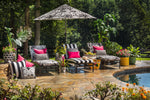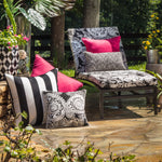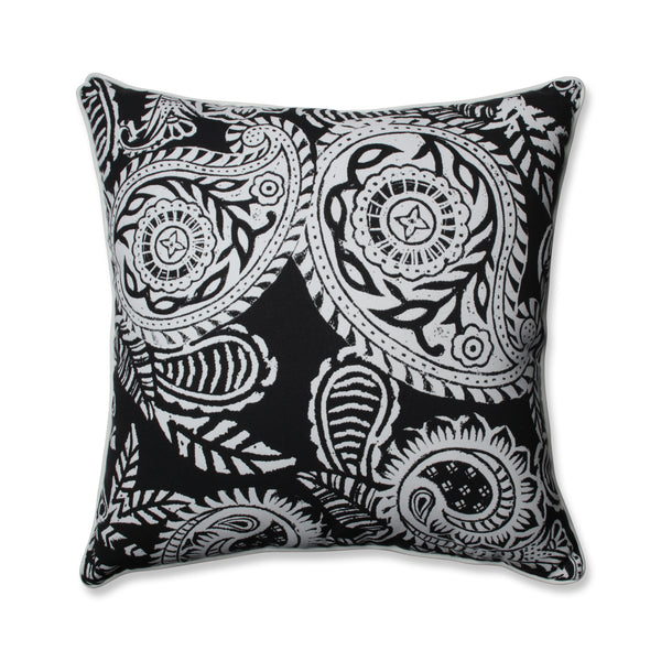 Rich ebony and sharp white spill across the fabric of this generously sized outdoor floor pillow in a whirling paisley pattern that adds tropical elegance to any outdoor space. Enjoy a new style for your backyard and add a plush seating option for guests. White cording finshes the look of this stunning pillow. Additional features of this outdoor floor pillow include recycled polyester fiber fill with a sewn seam closure. Also suitable for indoor use.