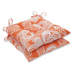 Feel the heat of summer with this lusciously fruity orange and crisp white paisley pattern that adds bright color to your festive poolside. Lazy twirls of paisley mixed with leaves and feather shapes give a playful tribal feel. This pair of outdoor tufted wrought iron chair cushions with matching ties is perfect for fun afternoons in the sun. Additional features include 14 inch ties and recycled polyester fiber fill with sewn seam closures. Also suitable for indoor use.
