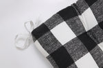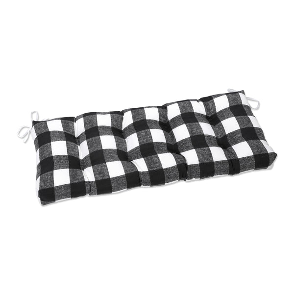 The classic buffalo check of this outdoor tufted bench cushion is a modern farmhouse must for any outdoor area. Printed on a textured ground, this large-scale check is in striking tones of black and white. Ideal for a fresh look on the patio, features tufted detailing, 14" ties, recycled polyester fiber fill and a sewn seam closure. Suitable for indoor use.