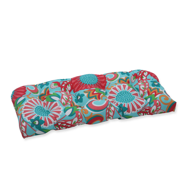 Joyful vibrance of a suzani inspired pattern makes this outdoor tufted loveseat cushion a delightful addition to your outdoor escape. In shades of coral and spring green with a pop of orange on an aqua ground, this stunning cushion ushers in new, irresistible style. Made of 100% polyester. Additional features of this outdoor tufted loveseat cushion include recycled polyester fiber fill and a sewn seam closure. Also suitable for indoor use.