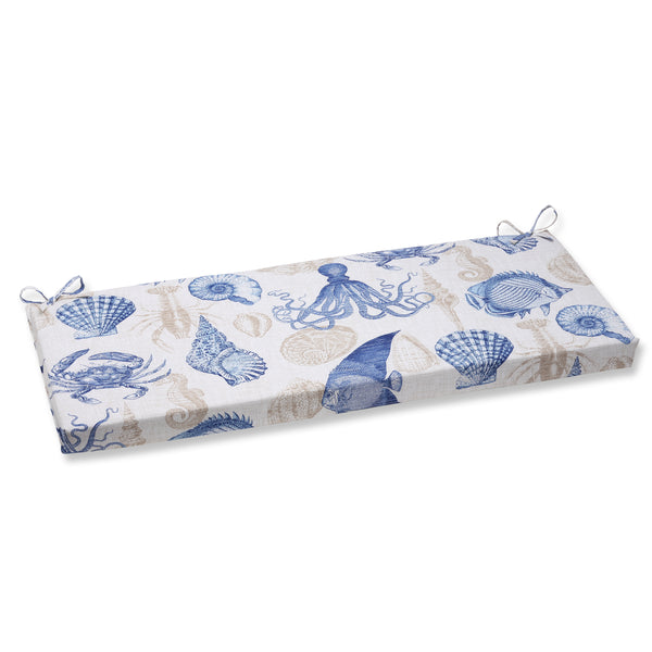 Bring beauty of the sea to your patio or deck with the stylish pattern of this outdoor bench cushion. Seashells, crustaceans, fish, seahorses and even an octopus appear in contrasting deep navy and khaki on an off-white ground with a linen-like textured look. Additional features of this outdoor bench cushion include square corners, 14" ties and recycled polyester fill with a zippered closure for easy removal. Also suitable for indoor use.