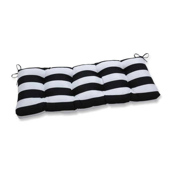 Dramatic and chic, the quintessential cabana stripe of this outdoor bench cushion is striking. Its bold black & white colors give a mod vibe, while the classic stipes add a nostalgic touch, which coordinates with many patterns and colors. Features tufted detailing, 14" ties, recycled polyester fiber fill and a sewn seam closure. Suitable for indoor use.