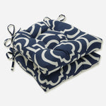 Bring a sharp, compelling look to your outdoor escape with this set of two outdoor tufted chair pads. Their interlocking, contemporary white pattern is set on navy blue for a "wow" effect. Fabric is durable and fade resistant. Features include 14" ties and recycled polyester fiber fill with sewn seam closures. Suitable for indoor use in dining areas.