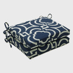 Enhance the color and comfort of your outdoor furniture with this set of two square cornered seat cushions. Bold white lines curve and angle over navy blue to create an interlocking contemporary design. Fade-resistant, these cushions are made of polyester fabric that stays brilliant through use. Additional features of these outdoor seat cushions include square corners, 14" ties and recycled polyester fill with zippered closures for easy removal. Also suitable for indoor use.