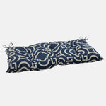 Looking to update your wrought iron furniture with some color and a chic modern design? The polyester fabric of this outdoor tufted wrought iron loveseat cushion is fade-resistant. Bold white lines curve and angle over navy blue to create an interlocking contemporary design. Additional features of this outdoor bench cushion include tufted detailing, 14" ties and recycled polyester fiber fill with a sewn seam closure. Also suitable for indoor use.