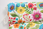 The flower garden print of this outdoor chair cushion brings a new look to your patio decor. Inspired by a painterly Scandinavian print, flowers dance across the fabric in bright shades of pink, orange, turquoise, yellow and green. Additional features of this outdoor chair cushion include rounded corners, 14" ties and recycled polyester fill with a sewn seam closure.