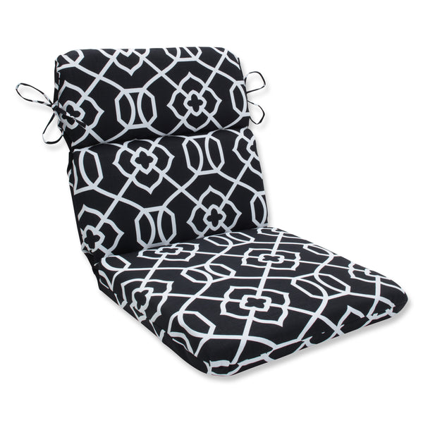 Make a fashion statement on your patio with this elegant black and white outdoor chair cushion. Its gripping white lattice like design has a delicate look and is set on a black ground for a modern effect. Additional features of this outdoor chair cushion include rounded corners, 14" ties and recycled polyester fill with a sewn seam closure.