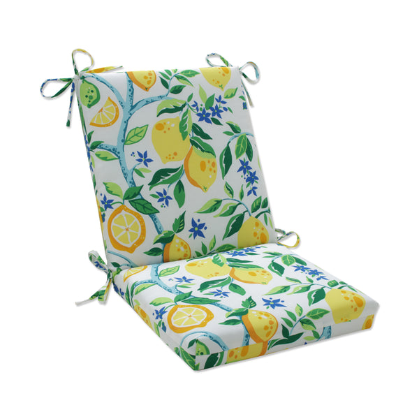 The lemon tree pattern of this outdoor chair cushion gives a warm and carefree vibe of summer. Bright yellow lemons with vivid green leaves pop off the crisp, white ground. Additional features of this outdoor chair cushion include square corners, 14" ties and recycled polyester fill with a sewn seam closure.