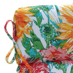 Bold bursts of sunflowers pop from this outdoor chair cushion creating a refreshing look for your outdoors. Substantial blooms and foliage in vivid shades of yellow, orange, green, blue and pink pop from the crisp white ground. A soft distressing adds artist-intended imperfections and character. Additional features of this outdoor chair cushion include rounded corners, 14" ties and recycled polyester fill with a sewn seam closure.