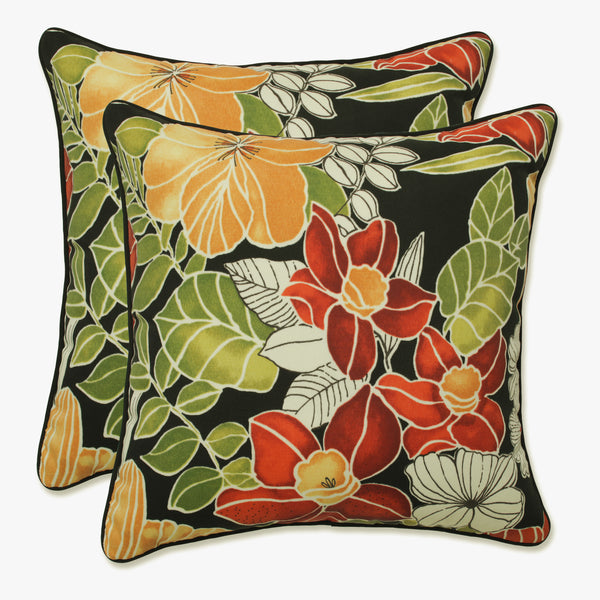 Say "Aloha" to the spirited flowers of Hawaii, which wonderfully blend together in the style of this set of two outdoor throw pillows. Set against a black ground, green, red and maize coordinate beautifully to create a robust floral pattern. Additional features of these outdoor decorative pillows include coordinating welt cords for a beautiful finish and recycled polyester fiber fill with sewn seam closures. Also suitable for indoor use.