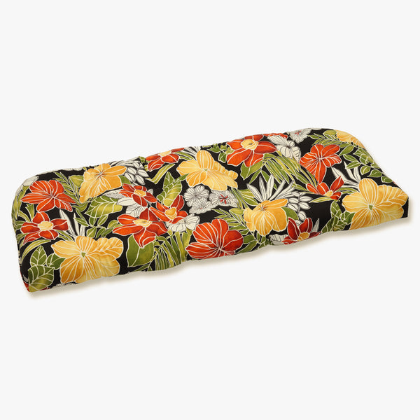 Say "Aloha" to the spirited flowers of Hawaii, which wonderfully blend together in the style of this outdoor tufted loveseat cushion. Set against a black ground, green, red and maize coordinate beautifully to create a robust floral pattern. Additional features of this outdoor tufted loveseat cushion include recycled polyester fiber fill and a sewn seam closure. Also suitable for indoor use.