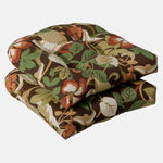 Harmonize your patio with the great outdoors using this set of two outdoor tufted wicker chair cushions. Botanical beauty soothes in shades of green, red and off-white set against a shade of dark brown. Fabric is durable and fade resistant. Additional features of these outdoor tufted wicker chair cushions include recycled polyester fiber fill and sewn seam closures. Also suitable for indoor use.