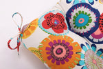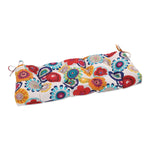 Let style bloom outside with the unique painterly flower pattern of this outdoor bench cushion. Multicolored, stylized flowers in shades of blue, yellow, green and red are set against an off-white ground. Additional features include tufted detailing, 14" ties and recycled polyester fiber fill with a sewn seam closure. Also suitable for indoor use.