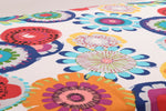 Let style bloom outside with the unique painterly flower pattern of this set of two outdoor tufted wicker chair cushions. Multicolored, stylized flowers in shades of blue, yellow, green and red are set against an off-white ground. Additional features of these outdoor tufted wicker chair cushions include recycled polyester fiber fill and sewn seam closures. Also suitable for indoor use.