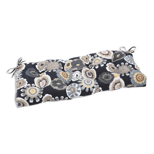 Delight in the painterly beauty of this floral outdoor bench cushion. A mix of flowers in neutral shades of gold, tan, brown, gray and off-white pop from a classic black ground. Fabric is durable and fade-resistant. Additional features include tufted detailing, 14-inch ties and recycled polyester fiber fill with a sewn seam closure. Suitable for indoor use.
