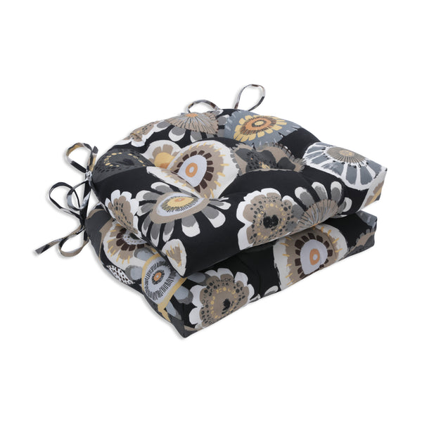 Delight in the painterly beauty of this set of two outdoor tufted chair pads. A mix of flowers in neutral shades of gold, tan, brown, gray and off-white pop from a classic black ground. Fabric is durable and fade-resistant. Features include 14-inch ties and recycled polyester fiber fill with sewn seam closures. Suitable for indoor use.