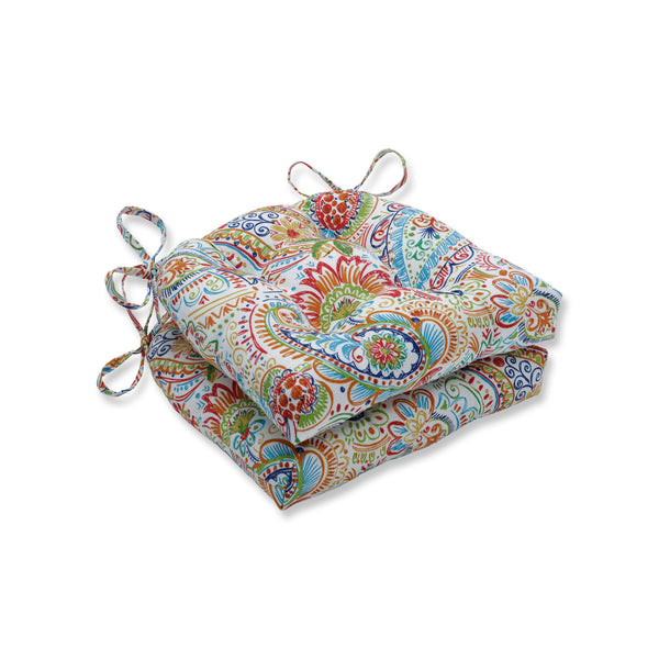 The elegance of this set of two outdoor tufted chair pads in a lively paisley and floral design is perfect for accenting a patio. Their vivid shades of red, aqua, green, orange, yellow and indigo blue bring life to the scene through artful beauty. Additional features of these outdoor tufted chair pads include 14" ties to secure the cushions to your furniture and recycled polyester fiber fill with sewn seam closures. Also suitable for indoor use in kitchen and dining areas.