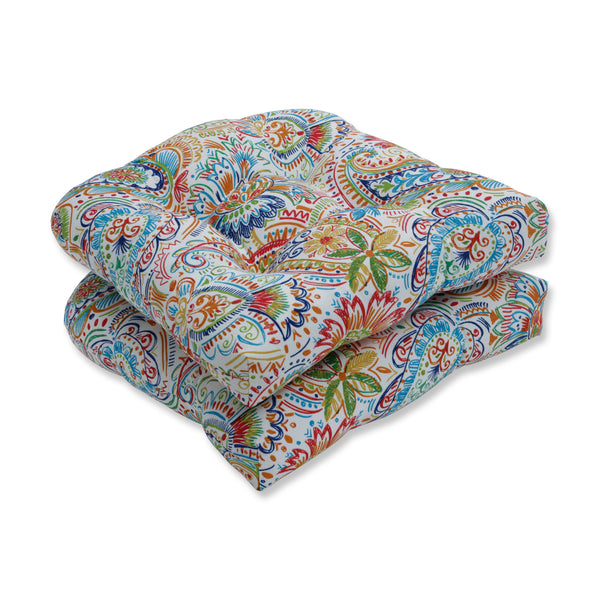 The elegance of this set of two outdoor tufted wicker chair cushions in a lively paisley and floral design is perfect for accenting a patio. Their vivid shades of red, aqua, green, orange, yellow and indigo blue bring life to the scene through artful beauty. Additional features of these outdoor tufted wicker chair cushions include recycled polyester fiber fill and sewn seam closures. Also suitable for indoor use.