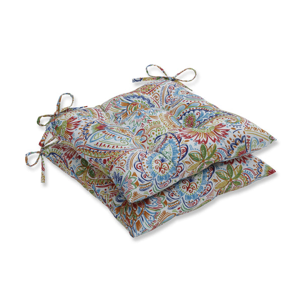 The elegance of this set of two outdoor tufted chair cushions in a lively paisley and floral design is perfect for accenting a patio. Their vivid shades of red, aqua, green, orange, yellow and indigo blue bring life to the scene through artful beauty. Additional features of these outdoor tufted chair cushions include 14" ties and recycled polyester fiber fill with sewn seam closures. Also suitable for indoor use.