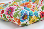 The flower garden print of this outdoor bench cushion brings a new look to your patio decor. Inspired by a painterly Scandinavian print, flowers dance across the fabric in bright shades of pink, orange, turquoise, yellow and green. Features include tufted detailing, 14" ties and recycled polyester fiber fill with a sewn seam closure. Also suitable for indoor use.