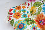 The flower garden print of this large outdoor bench cushion brings a new look to your patio decor. Inspired by a painterly Scandinavian print, flowers dance across the fabric in bright shades of pink, orange, turquoise, yellow and green. Features include tufted detailing, 14" ties and recycled polyester fiber fill with a sewn seam closure. Also suitable for indoor use.