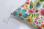 The flower garden print of this set of two outdoor tufted chair cushions brings a new look to your patio decor. Inspired by a painterly Scandinavian print, flowers dance across the fabric in bright shades of pink, orange, turquoise, yellow and green. Additional features of these outdoor tufted chair cushions include 14" ties and recycled polyester fiber fill with sewn seam closures. Also suitable for indoor use.