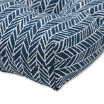 The rustic appeal of this large outdoor bench cushion is perfect for creating a casual outdoor escape. With a dimensional look, its eye-catching herringbone pattern is in an off-white set against a dark blue ground. Additional features of this large outdoor bench cushion include tufted detailing, 14" ties, recycled polyester fiber fill and a sewn seam closure. Also suitable for indoor use.