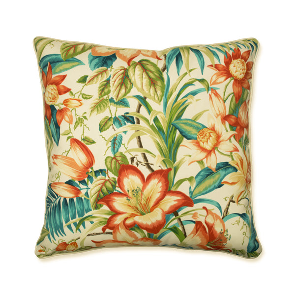 The printed floral pattern of this outdoor floor pillow provides a refreshing change for your patio. In a wonderful tangle of saturated oranges, blues and greens, the lush, leafy foliage and gorgeous tiger lilies pop off the cream colored ground. Additional features of this outdoor floor pillow include a coordinating welt cord that gives it a high-end designer look and recycled polyester fiber fill with a sewn seam closure. Also suitable for indoor use.