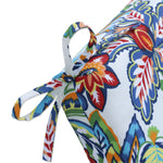 Bringing distinctive color-rich design to patios and porches, this outdoor chair cushion adds bold style with its vibrant floral print. This impeccable design boasts large blooms in vivid shades of red, blue, green, orange and yellow that pop off the off-white ground. Additional features of this outdoor chair cushion include square corners, 14" ties and recycled polyester fill with a sewn seam closure.