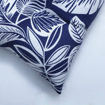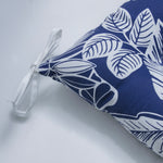 Oversized white leaves tell a monochromatic story on a striking navy blue ground with this set of two outdoor tufted chair cushions. The pattern is printed on outdoor fade-resistant polyester fabric that has a slub texture for added dimension. Additional features of these outdoor tufted chair cushions include 14-inch ties and recycled polyester fiber fill with sewn seam closures. Also suitable for indoor use.