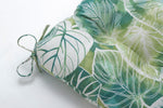 Accent your patio or deck in the gorgeous look of a tropical rainforest with this large outdoor bench cushion. Its leafy print pattern, in watercolor shades of green and blue with white outlined leaves, covers the linen textured fabric. Additional features of this large outdoor bench cushion include tufted detailing, 14" ties and recycled polyester fiber fill with a sewn seam closure. Also suitable for indoor use.