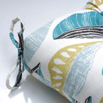 This wood block inspired pattern is designed to modernize any outdoor space with this large outdoor bench cushion. Large-scale, abstract leaves colored in shades of teal, spa blue and espresso brown are printed on outdoor fade-resistant polyester fabric that has a slub texture for added dimension. Additional features of this large outdoor bench cushion include tufted detailing, 14-inch ties and recycled polyester fiber fill with a sewn seam closure. Also suitable for indoor use.