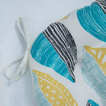 This wood block inspired pattern is designed to modernize any outdoor space with this set of two large outdoor tufted chair pads. Large-scale, abstract leaves colored in shades of teal, spa blue and espresso brown are printed on outdoor fade-resistant polyester fabric that has a slub texture for added dimension. Additional features of these large outdoor tufted chair pads include 14-inch ties to secure the cushions to your furniture and recycled polyester fiber fill with sewn seam closures. Also suitable for indoor use in kitchen and dining areas.