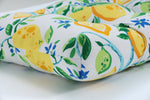The lemon tree pattern of this large outdoor bench cushion gives a warm and carefree vibe of summer. Bright yellow lemons with vivid green leaves pop off the crisp, white ground. Additional features of this large outdoor bench cushion include tufted detailing, 14" ties and recycled polyester fiber fill with a sewn seam closure. Also suitable for indoor use.
