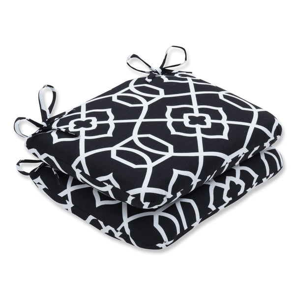 Make a fashion statement on your patio with this set of two elegant black and white outdoor seat cushions. Their gripping white lattice like design has a delicate look and is set on a black ground for a modern effect. Additional features of these outdoor seat cushions include rounded corners, 14" ties and recycled polyester fill with sewn seam closures. Also suitable for indoor use.