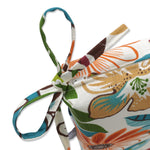 Bring the colorful beauty of a tropical jungle to life on your patio with this set of two outdoor seat cushions. Flowers, foliage and decorated parrots are in gorgeous shades of brown, tan, red, blue and orange set on an off-white ground. Additional features of these outdoor seat cushions include square corners, 14" ties and recycled polyester fill with zippered closures for easy removal. Also suitable for indoor use.
