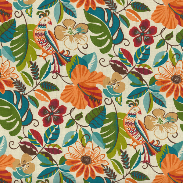 Get ready to party with parrots with this boldly colored jungle pattern! Rich shades of coffee, sand, berry, teal, and sunny orange bring the scene to life, while gorgeous parrots dart amongst the foliage with glee. On off-white artistic slub fabric flowers bloom in apple red, dark orange, golden sand, and aqua blue perfect for bringing color to your white furniture.