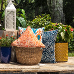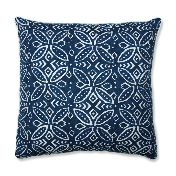This globally inspired design offers a perfect welcome printed on this outdoor floor pillow. Inspired from block printed designs, the repetitive pattern has petal-like shapes in off-white set against a traditional indigo blue ground, a perfect accent for a cosmopolitan outdoor living space. Made of 100% polyester. Additional features of this outdoor floor pillow include a white coordinating welt cord for a clean finish and recycled polyester fiber fill with a sewn seam closure. Also suitable for indoor use.