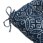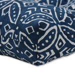 This globally inspired design offers a perfect welcome printed on this outdoor bench cushion. Inspired from block printed designs, the repetitive pattern has petal-like shapes in off-white set against a traditional indigo blue ground, a perfect accent for a cosmopolitan outdoor living space. Made of 100% polyester. Additional features of this outdoor bench cushion include tufted detailing, 14" ties and recycled polyester fiber fill with a sewn seam closure. Also suitable for indoor use.