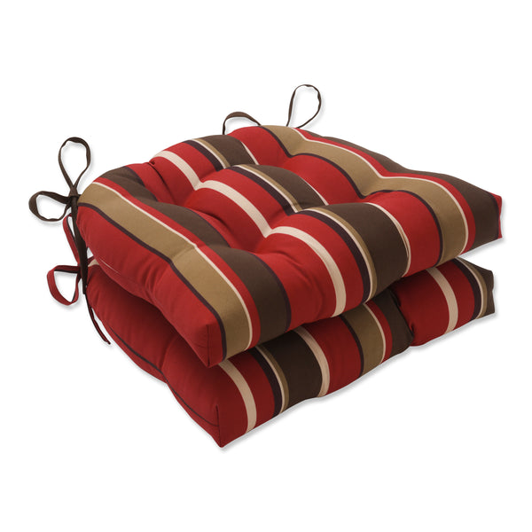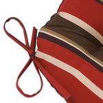 Accent your porch or patio with the modern vibe of this set of two striped outdoor tufted chair pads. Their pattern has various widths of stripes in shades of red, brown and tan to create a handsome style. Fabric is durable and fade resistant. Additional features of these outdoor tufted chair pads include 14" ties to secure the cushions to your furniture and recycled polyester fiber fill with sewn seam closures. Also suitable for indoor use in kitchen and dining areas.