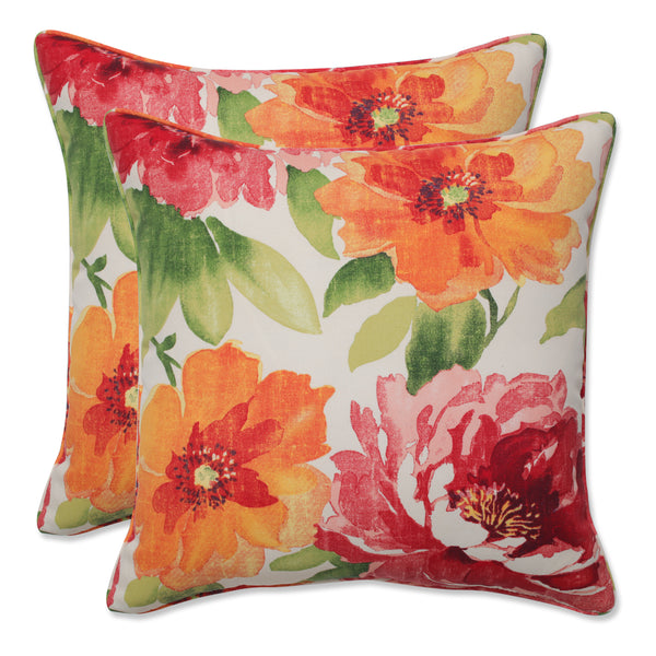 Add ambiance to your porch with the gorgeous flair of this set of two outdoor decorative pillows. Their watercolor pattern with large-scale, detailed flowers is in shades of red and orange on an off-white ground. Fabric is durable and fade resistant. Additional features of these outdoor decorative pillows include self welt cords for a clean finish and recycled polyester fiber fill with sewn seam closures. Also suitable for indoor use.
