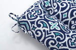 Modern flair and the elegance of this outdoor bench cushion set the scene for cheer in any outdoor setting. In bright shades of cobalt blue and turquoise, its damask pattern is accented with flowers, diamonds and fleur-de-lis. Additional features of this outdoor bench cushion include tufted detailing, 14" ties and recycled polyester fiber fill with a sewn seam closure. Also suitable for indoor use.
