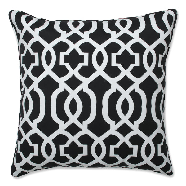 The black and white design of this large outdoor floor pillow grips your attention with elegance. On a black ground, its interlocking white geometric pattern contrasts beautifully on the fade resistant fabric for a modern look. Additional features of this outdoor floor pillow include a self welt cord for a clean finish and recycled polyester fiber fill with a sewn seam closure. Also suitable for indoor use.