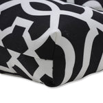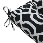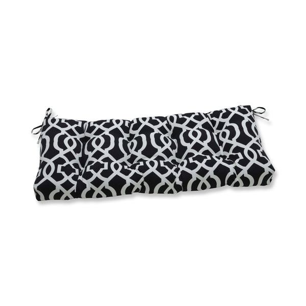 The black and white design of this outdoor bench cushion grips your attention with elegance. On a black ground, its interlocking white geometric pattern contrasts beautifully on the fade resistant fabric for a modern look. Additional features of this outdoor bench cushion include tufted detailing, 14" ties and recycled polyester fiber fill with a sewn seam closure. Also suitable for indoor use.