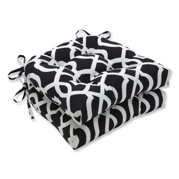 The black and white design of this set of two large outdoor tufted chair pads grips your attention with elegance. On a black ground, their interlocking white geometric pattern contrasts beautifully on the fade resistant fabric for a modern look. Additional features of these large outdoor tufted chair pads include 14" ties to secure the cushions to your furniture and recycled polyester fiber fill with sewn seam closures. Also suitable for indoor use in kitchen and dining areas.