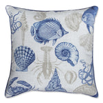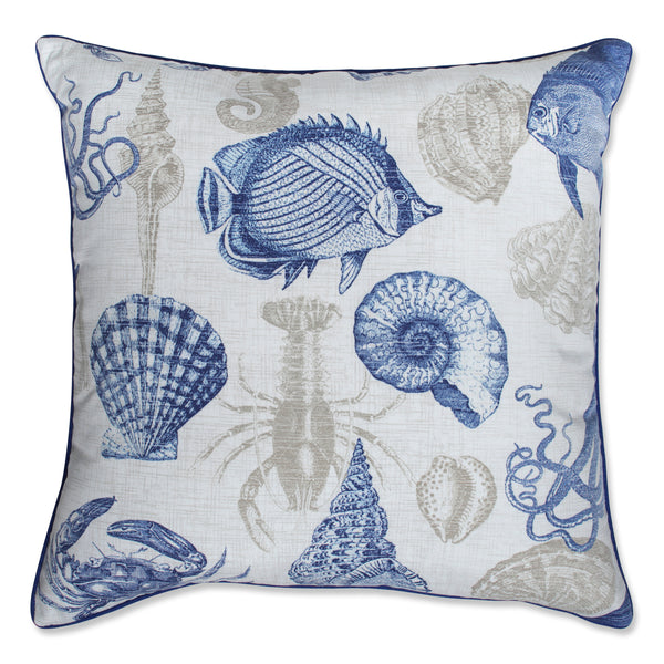 Bring beauty of the sea to your patio or deck with the stylish pattern of this outdoor floor pillow. Seashells, crustaceans, fish, seahorses and even an octopus appear in contrasting deep navy and khaki on an off-white ground with a linen-like textured look. Additional features of this outdoor floor pillow include a blue coordinating welt cord for a clean finish and recycled polyester fiber fill with a sewn seam closure. Also suitable for indoor use.
