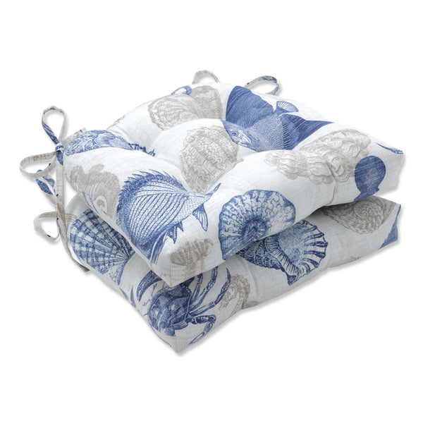 Bring beauty of the sea to your patio or deck with the stylish pattern of this set of two large outdoor tufted chair pads. Seashells, crustaceans, fish, seahorses and even an octopus appear in contrasting deep navy and khaki on an off-white ground with a linen-like textured look. Polyester fabric is weather- and UV-resistant. Additional features of these large outdoor tufted chair pads include 14" ties to secure the cushions to your furniture and recycled polyester fiber fill with sewn seam closures. Also suitable for indoor use in kitchen and dining areas.
