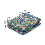 Brighten outdoor living space with this set of two outdoor seat cushions. Their stylized geometric figures in contemporary shapes create a non-directional pattern. Shades of indigo, turquoise, terra-cotta and green make up their eye-catching pattern. Additional features of these outdoor seat cushions include rounded corners, 14" ties and recycled polyester fill with sewn seam closures. Also suitable for indoor use.