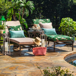 Bring the tropics home with this outdoor chaise lounge cushion. Its bold, tropical pattern has large palm leaves in vibrant shades of green and turquoise. The palm leaves pop against the soft pastel pink ground for an updated, fresh look. Additional features of this outdoor chaise lounge cushion include 14" ties to secure the cushion to your furniture, square corners and recycled polyester fill with a sewn seam closure.